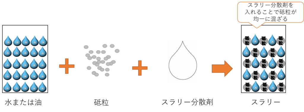 スラリー分散剤とは、何かを研磨する際に使う、スラリーの中に遊離砥粒を均一に分散させるための薬剤でしたね。