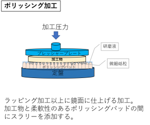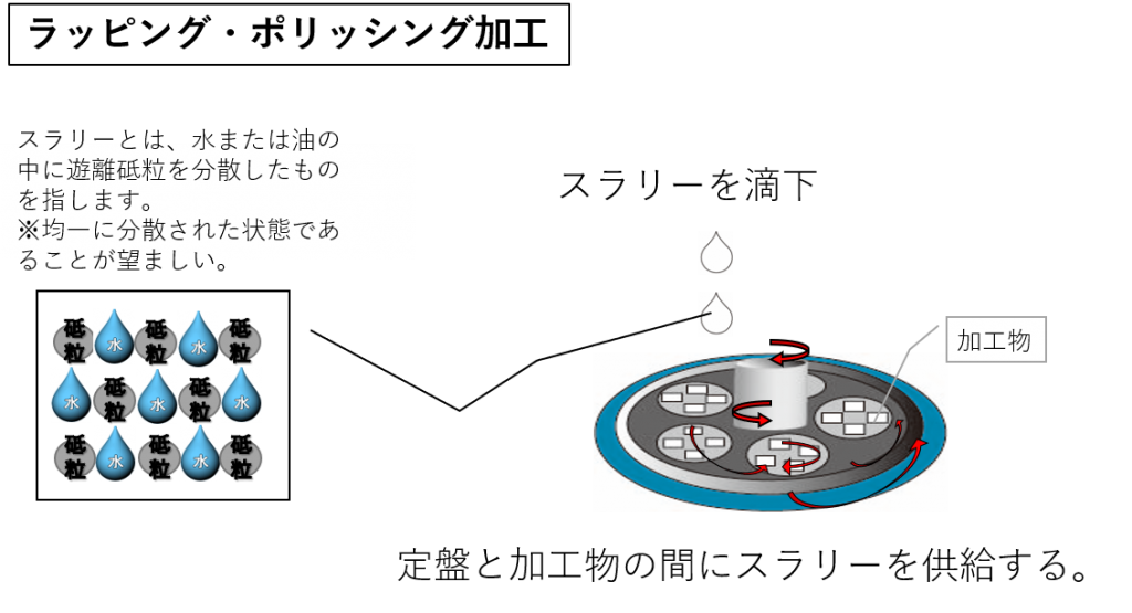 ラッピング・ポリッシング加工とは、金属材料やガラス材料などの表面を、スラリーを用いて研磨する超微細研磨加工方法のこと。