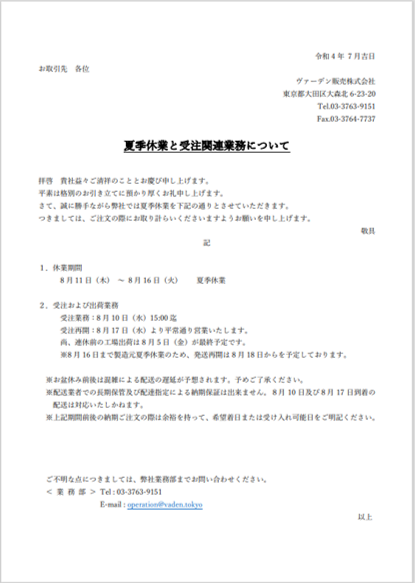 2022年8月9日 / 最終更新日時 : 2022年8月9日 Vaden Web Administrator 夏季休業 XBlueskyCopy コメントを残す コメントをキャンセルメールアドレスが公開されることはありません。 ※ が付いている欄は必須項目ですコメント ※ 名前 ※ メール ※ サイト 次回のコメントで使用するためブラウザーに自分の名前、メールアドレス、サイトを保存する。 上に表示された文字を入力してください。 Δ